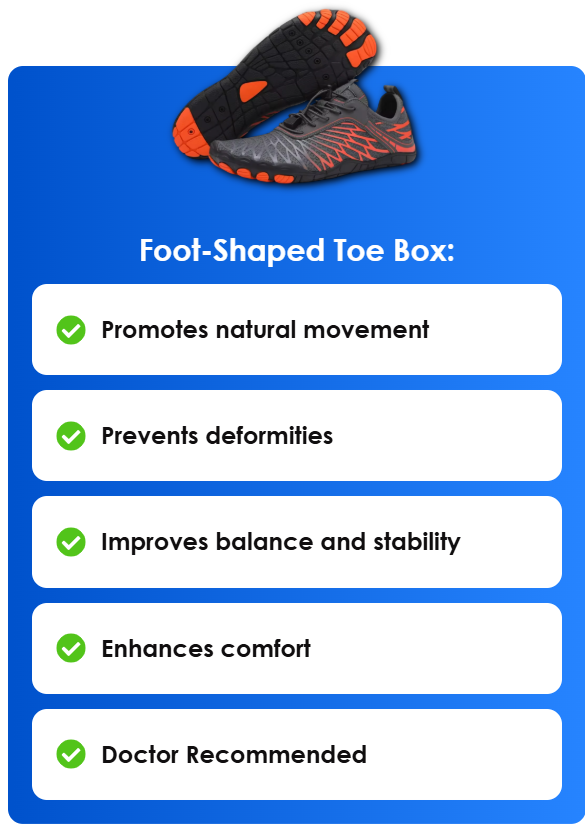 Let your toes breathe, spread, and move naturally with our wide toe box design. It helps reduce pressure, irritation, and friction — especially for wide feet, bunions, and hammertoes.